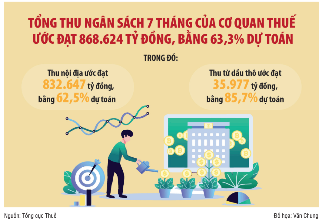 7 tháng đầu năm 2023, ngành Thuế thực hiện nhiệm vụ thu ngân sách trong bối cảnh nền kinh tế vẫn còn nhiều khó khăn, thách thức. Theo đó, 6/20 khoản thu, sắc thuế đạt dưới 60% so với dự toán; 7/20 khoản thu, sắc thuế đạt thấp hơn so với cùng kỳ năm trước. Để bù đắp các khoản thu, sắc thuế có tiến độ thu sụt giảm, ngành Thuế sẽ chú trọng vào công tác thanh tra, kiểm tra, thu hồi nợ thuế; triển khai có hiệu quả các đề án chống thất thu thuế.