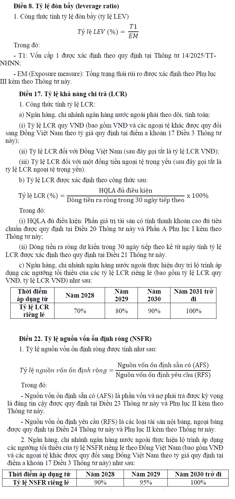 Liên quan đến hai tỷ lệ LCR và NSFR, Điều 14 của dự thảo quy định cụ thể lộ trình áp dụng. Theo đó, từ ngày 01/01/2028, các ngân hàng và chi nhánh ngân hàng nước ngoài phải thực hiện đầy đủ các quy định về hai tỷ lệ này. Giai đoạn trước đó, các tổ chức tín dụng tiếp tục tuân thủ các quy định hiện hành theo Thông tư 22/2019/TT-NHNN, bao gồm các yêu cầu về khả năng chi trả và giới hạn sử dụng vốn ngắn hạn cho vay trung dài hạn.