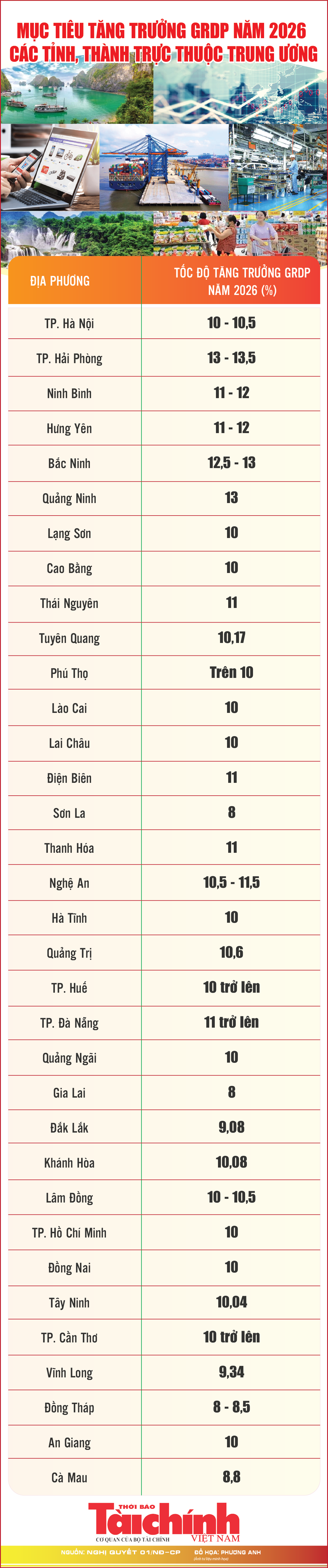 Infographics: Mục tiêu tăng trưởng GRDP năm 2026 của các tỉnh, thành trực thuộc Trung ương