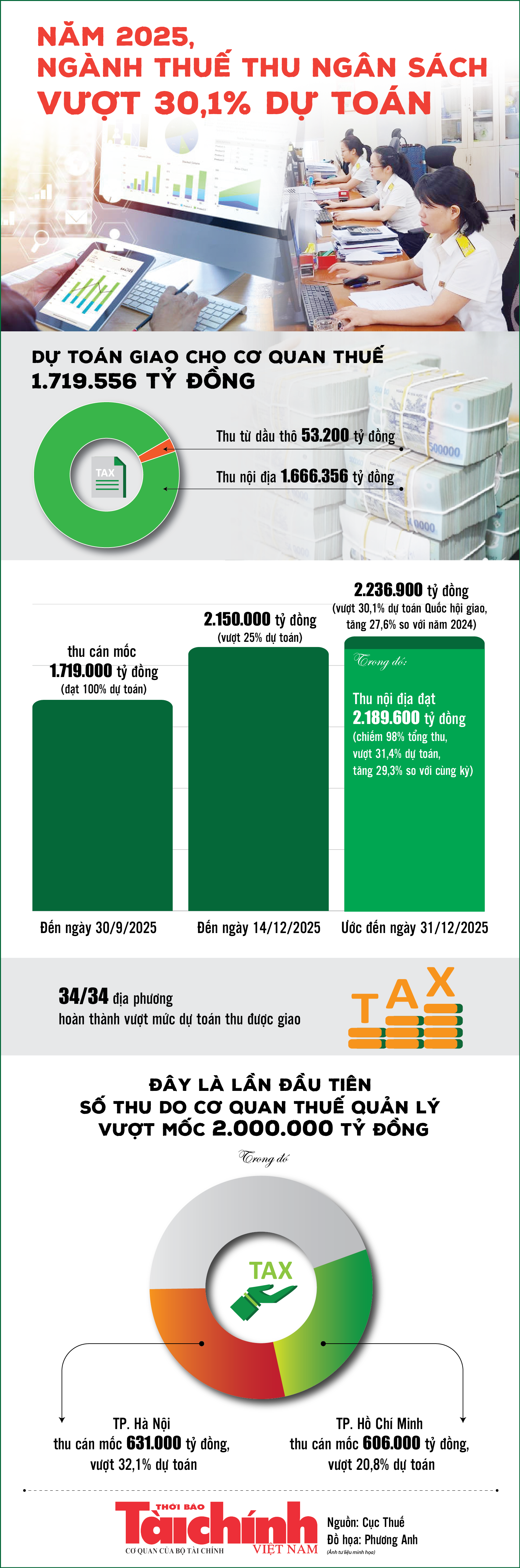 (TBTCO) - Theo báo cáo của Cục Thuế, tính đến ngày 14/12/2025, số thu ngân sách do cơ quan thuế quản lý đạt mốc 2.150 nghìn tỷ đồng; ước đến ngày 31/12/2025, toàn ngành thu đạt 2.236,9 nghìn tỷ đồng, vượt 30,1% dự toán Quốc hội giao. Kết quả trên đánh dấu bước trưởng thành vượt bậc về quy mô nguồn thu sau 80 năm xây dựng và phát triển của ngành Thuế.