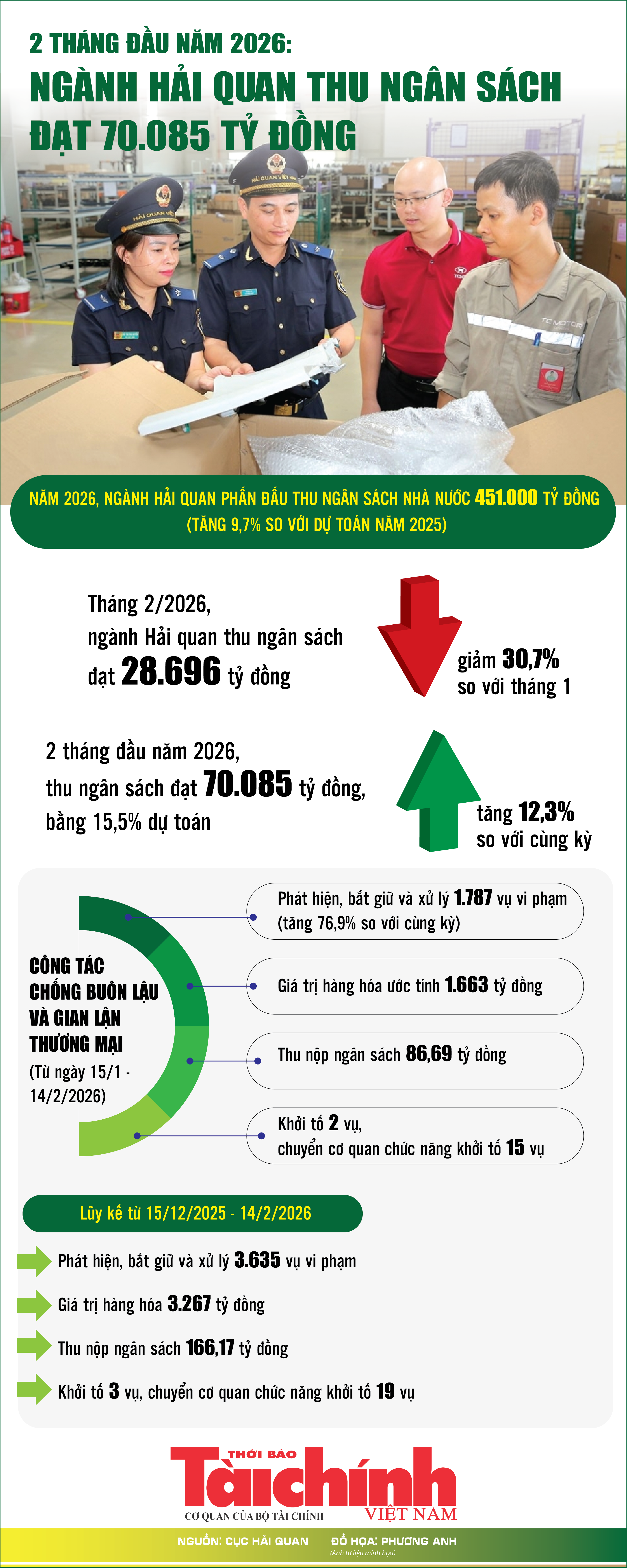(TBTCO) - Theo Cục Hải quan, tháng 2/2026 thu ngân sách đạt 28.696 tỷ đồng; lũy kế 2 tháng đầu năm 2026, thu đạt 70.085 tỷ đồng, bằng 15,5% so với dự toán, bằng 13,6% so với chỉ tiêu phấn đấu và tăng 12,3% so với cùng kỳ.
