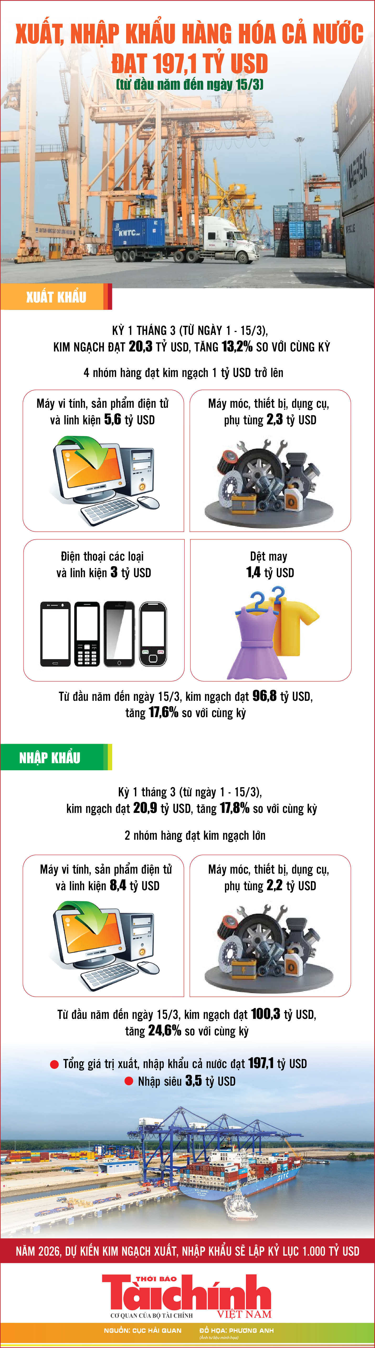 (TBTCO) - Theo số liệu Cục Hải quan, tính từ đầu năm đến ngày 15/3/2026, quy mô kim ngạch xuất, nhập khẩu cả nước đạt 197,1 tỷ USD. Trong đó, xuất khẩu đạt 96,8 tỷ tỷ USD; nhập khẩu đạt 100,3 tỷ USD; cán cân thương mại thâm hụt 3,5 tỷ USD.