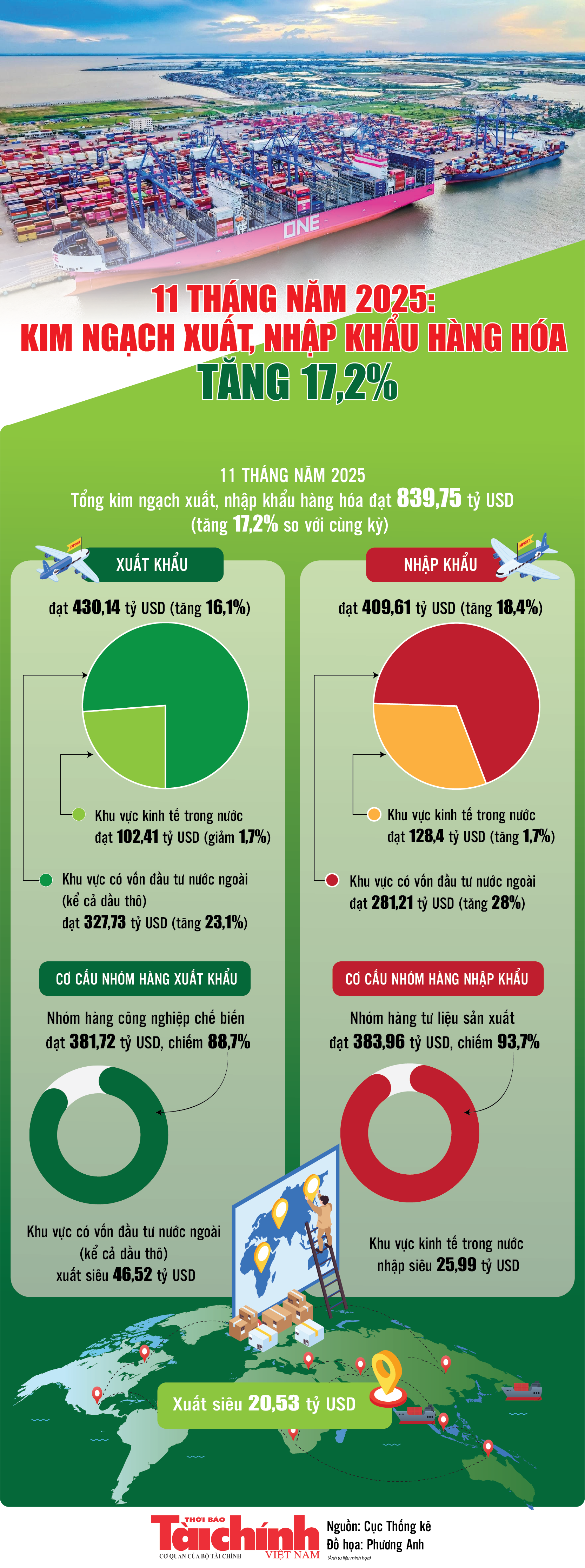 (TBTCO) - Theo Cục Thống kê (Bộ Tài chính), 11 tháng năm 2025, quy mô kim ngạch xuất, nhập khẩu cả nước đạt 839,75 tỷ USD, tăng 17,2% so với cùng kỳ năm trước. Trong đó, xuất khẩu tăng 16,1%; nhập khẩu tăng 18,4%. Cán cân thương mại hàng hóa xuất siêu 20,53 tỷ USD.
