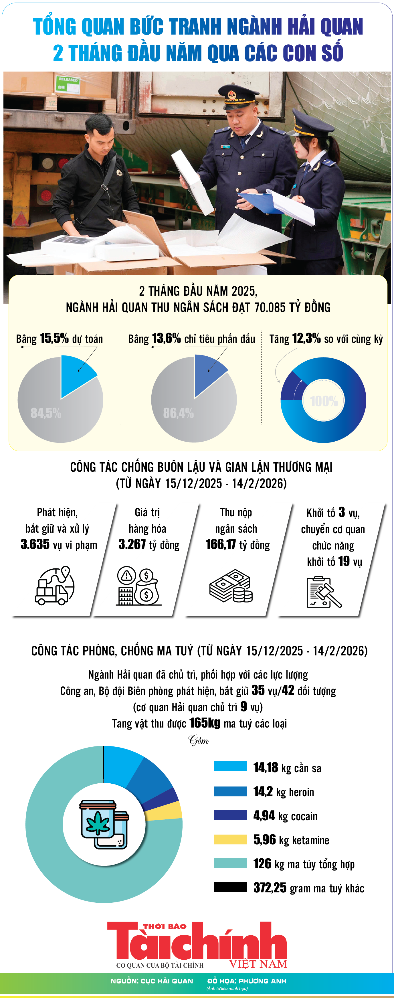 (TBTCO) - Theo Cục Hải quan (Bộ Tài chính), số thu ngân sách của ngành Hải quan từ hoạt động xuất, nhập khẩu 2 tháng ước đạt 70.085 tỷ đồng; phát hiện, bắt giữ và xử lý 3.635 vụ việc vi phạm; thu được 165kg ma tuý các loại… là những con số nổi bật trong 2 tháng đầu năm 2026.