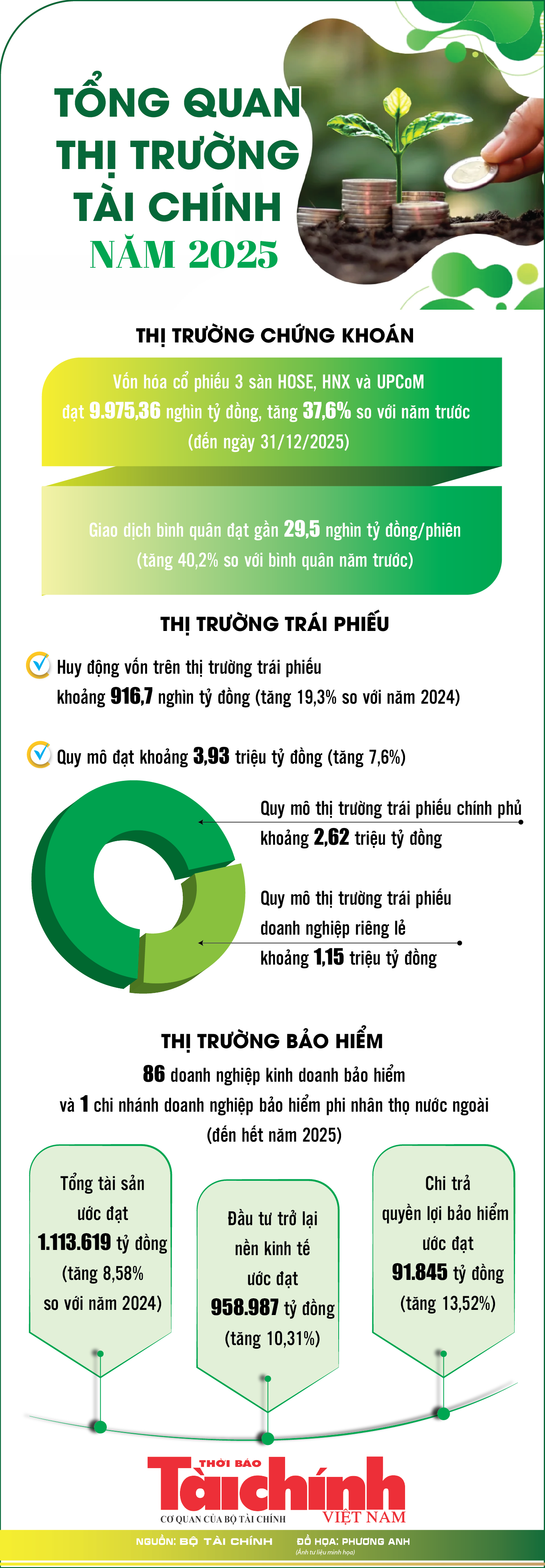 (TBTCO) - Theo Bộ Tài chính, đến ngày 31/12/2025, quy mô vốn hóa thị trường cổ phiếu 3 sàn HOSE, HNX và UPCoM đạt 9.975,36 nghìn tỷ đồng, tăng 37,6% so với cuối năm trước; tổng tài sản của các doanh nghiệp bảo hiểm trong năm 2025 ước đạt 1.113.619 tỷ đồng, tăng 8,58% so với năm 2024.