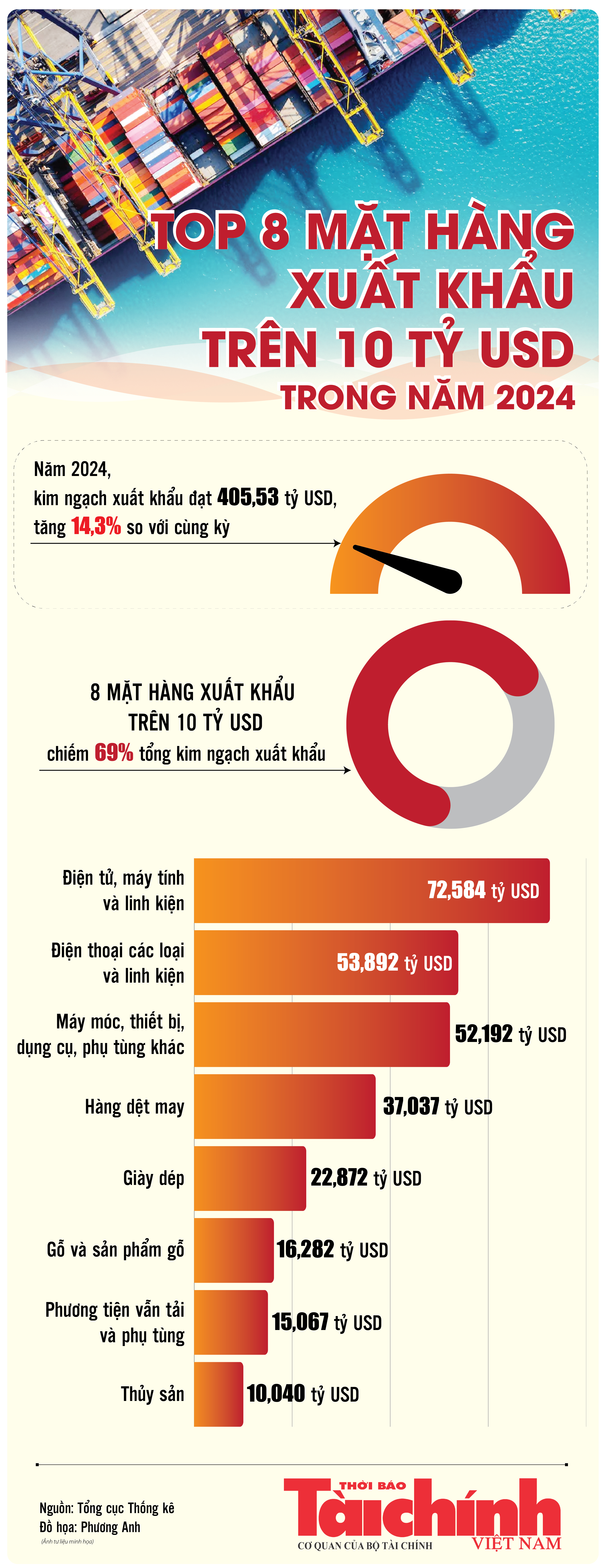 Infographics: Top 8 mặt hàng xuất khẩu trên 10 tỷ USD trong năm 2024