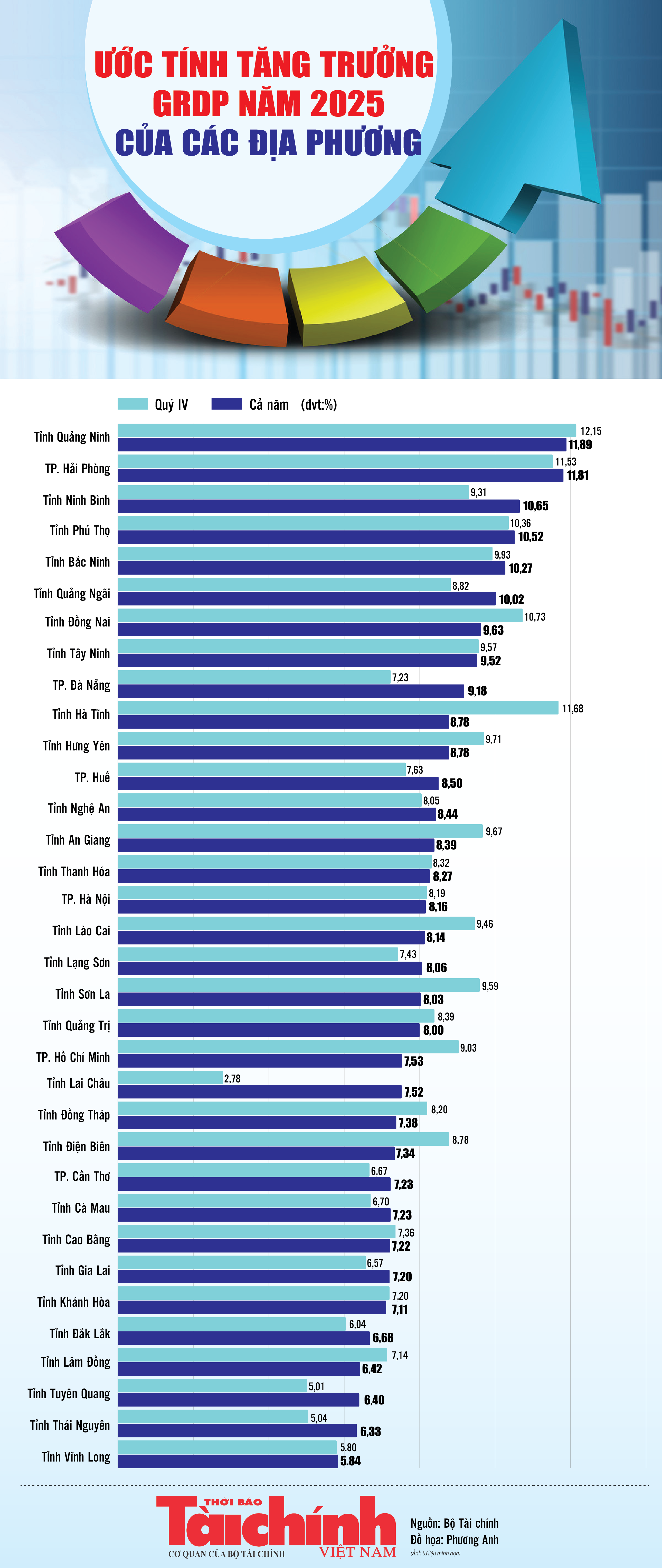 (TBTCO) - Theo báo cáo của Bộ Tài chính, tổng sản phẩm trên địa bàn (GRDP) quý IV/2025 của các địa phương tiếp tục duy trì đà tăng trưởng. Có 20/34 địa phương tăng trưởng đạt từ 8% trở lên. Trong đó, có 5 địa phương tăng trưởng trên 10%. Ước tính trong năm 2025 sẽ có 6 địa phương tăng trưởng 2 con số gồm Quảng Ninh, Hải Phòng, Ninh Bình, Phú Thọ, Bắc Ninh, Quảng Ngãi.