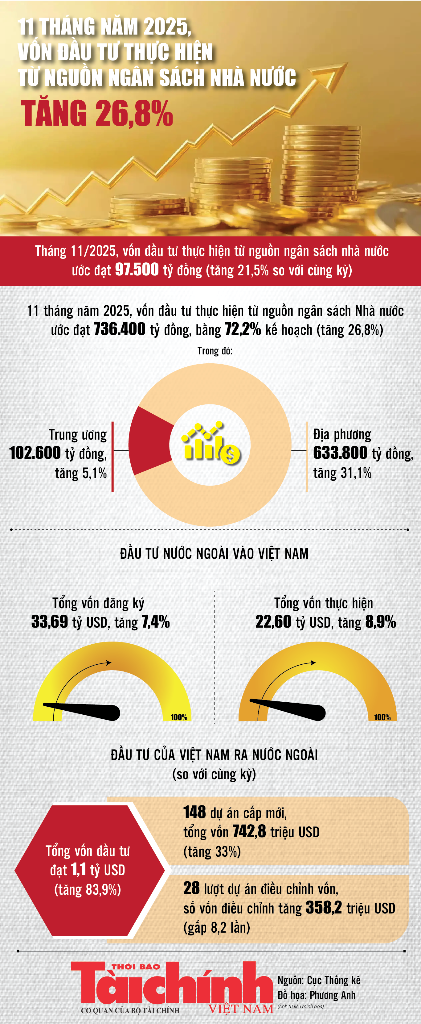 (TBTCO) - Theo Cục Thống kê, lũy kế 11 tháng năm 2025, vốn đầu tư thực hiện từ nguồn ngân sách nhà nước ước đạt 736.400 tỷ đồng, bằng 72,2% kế hoạch năm và tăng 26,8% so với cùng kỳ năm trước.