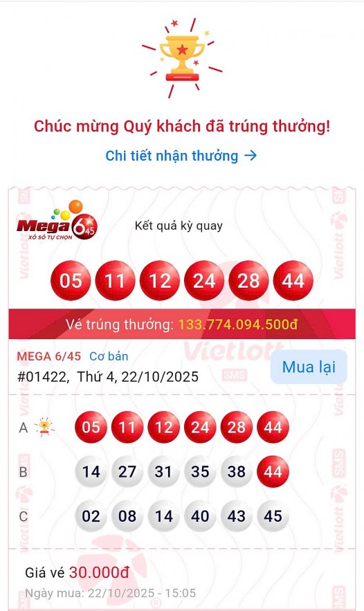 Ngày 11/11/2025, Công ty Xổ số Điện toán Việt Nam (Vietlott) đã tiến hành trao giải Jackpot xổ số tự chọn Mega 6/45 kỳ quay số mở thưởng 01422 đến anh N.C.L – thuê bao MobiFone may mắn đến từ tỉnh Khánh Hòa.